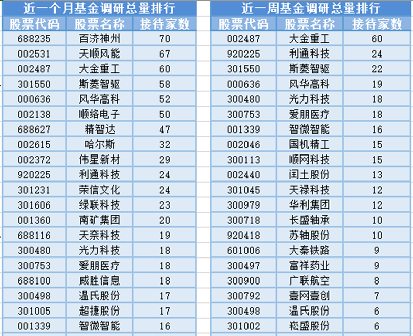 将时间周期缩短到最近一周(3月2日-3月9日)来看,基金调研数量第一的公司是大金重工,大金重工属于风电行业,主营业务为海上风电装备研发与制造、远洋特种运输、船舶设计与建造、新能源开发与运营、风电母港运营。大金重工共被60家基金机构调研,其次被调研数量较多的股票是利通科技、斯菱智驱和风华高科,分别接受24家、22家和19家基金机构的调研。