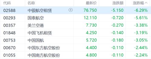 航空股继续下跌行情,中国航空租赁跌超6%,国泰航空跌超5%,美兰空港、中国飞机租赁等跟跌。