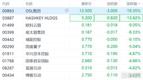 加密货币概念大跌,OSL集团跌超19%,欧科云链跌超9%,国富量子、华兴资本控股、国泰君安国际等跟跌。