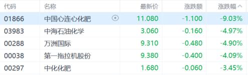 农业股走弱,中国心连心化肥跌超9%,中海石油化学、万洲国际、第一拖拉机股份跌超4%,中化化肥跌超3%。