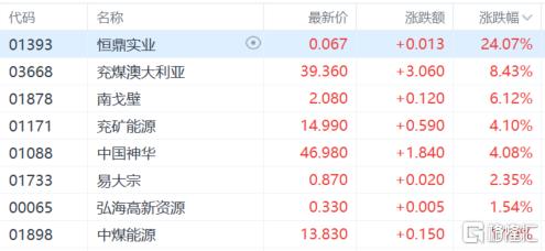 煤炭股涨幅居前,兖煤澳大利亚涨超8%,南戈壁涨超6%,兖矿能源、中国神华、易大宗等跟涨。