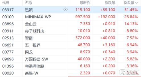 AI概念股走强,迅策暴涨超51%,Minimax涨超23%,金山云涨超14%,赤子城科技、智谱等跟涨。