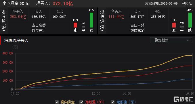 今日,南向资金净买入372.13亿港元,其中港股通(沪)净买入260.64亿港元,港股通(深)净买入111.49亿港元。