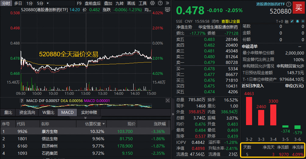 二级市场方面,港股市场今日(3月9日)深度调整,此前两个交易日连续大涨的创新药板块迎来回调,港股通创新药ETF(520880)调仓生效首日收跌2.05%,止步两连阳,全天振幅超3%,成交3.74亿元。