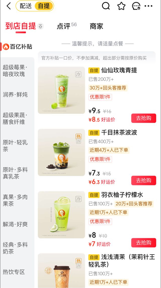 消费场景也在京东外卖发生巧妙延伸,“到店自提”模式日益流行,这不仅是出于节省的考虑,更成为一种规划线下社交的新方式。在这个难得清闲的节日,晶晶约上闺蜜终于看上了心心念念的电影,出门前特意点上两杯朋友爱喝的沪上阿姨千目抹茶波波,到店自提不但再减一元,最关键的是省去了排队点单的烦恼,也不用担心错过电影开场。这个三八节像晶晶这样的女性消费者不在少数,线上下单、到店自提,高效地与家人、好友开启聚会,让便捷与实惠兼得。在到店自提需求的带动下,瑞幸咖啡、库迪咖啡、幸运咖等品牌节日期间自提订单翻倍,展现了轻脂、轻卡饮品的巨大潜力 。而新茶饮赛道订单同样表现亮眼,蜜雪冰城、茶百道在京东自提订单环比增长100%,爷爷不泡茶环比增长200%,沪上阿姨环比增长300%。