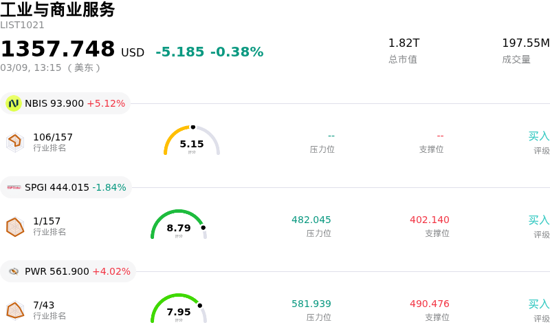 广达服务 (PWR) 盘中上涨4.02%, 所属行业工业与商业服务下跌0.38% ,公司涨幅跑赢行业涨幅,行业成交额前三股票 Nebius Group NV (NBIS) 上涨 5.12%;标普全球 (SPGI) 下跌 1.84%;广达服务 (PWR) 上涨 4.02%。