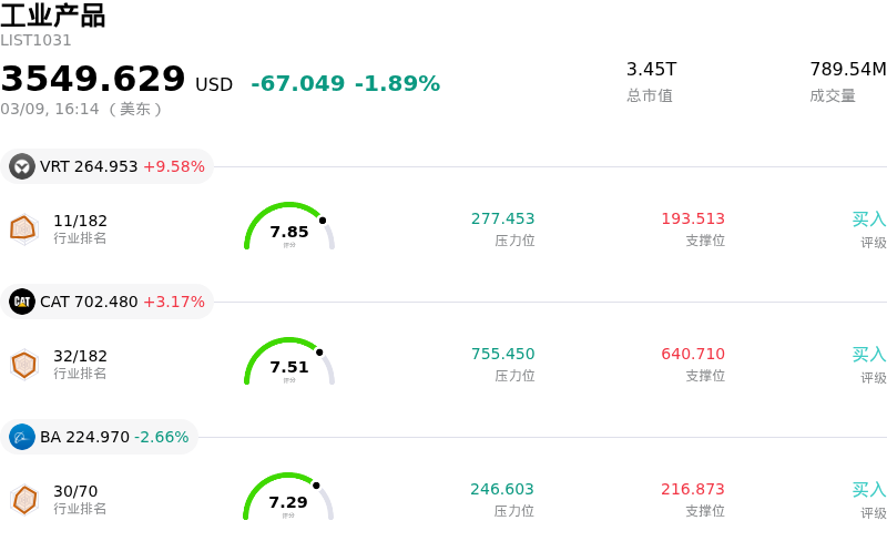 Caterpillar Inc (CAT) 收盘上涨3.17%, 所属行业工业产品下跌1.89% ,公司涨幅跑赢行业涨幅,行业成交额前三股票 Vertiv Holdings Co (VRT) 上涨 9.58%;Caterpillar Inc (CAT) 上涨 3.17%;波音 (BA) 下跌 2.66%。