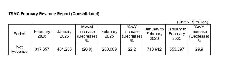TradingKey - 3月10日周二,晶圆代工龙头台积电(TSM)披露最新营收数据:2月单月合并营收达新台币3176.6亿元,虽较上月环比回落20.8%,但同比仍实现22.2%的稳健增长;今年1-2月累计营收约7189.1亿元新台币,较去年同期大幅提升29.9%。