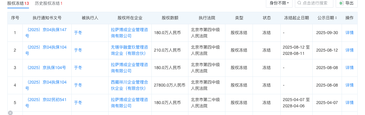 另据天眼查APP,于冬名下关联企业近50家,而其中于冬所持多家公司的股份已被冻结,涉及的公司包括西藏祥川企业管理合伙企业(有限合伙)、拉萨博成企业管理咨询有限公司、北京汇鑫骏宸文化交流有限公司等。