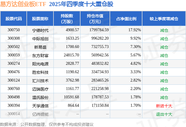 根据2025基金年报公募基金重仓股数据,重仓该股的公募基金共1975家,其中持有数量最多的公募基金为易方达基金的易方达创业板ETF。易方达创业板ETF目前规模为4.46亿元,最新净值3.1995(3月9日),较上一交易日下跌0.63%,近一年上涨47.91%。该公募基金现任基金经理为成曦 刘树荣。成曦在任的基金产品包括:易方达创业板ETF联接A,管理时间为2016年5月7日至今,期间收益率为54.68%;易方达深证100ETF,管理时间为2016年5月7日至今,期间收益率为84.31%;易方达上证科创板50ETF,管理时间为2020年9月28日至今,期间收益率为2.24%。刘树荣在任的基金产品包括:易方达深证100ETF联接A,管理时间为2017年7月18日至今,期间收益率为63.01%;易方达创业板ETF联接A,管理时间为2017年7月18日至今,期间收益率为92.03%;易方达深证100ETF,管理时间为2017年7月18日至今,期间收益率为62.72%;