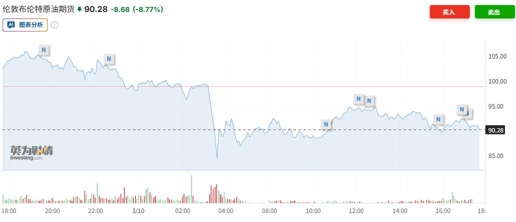 原油市场方面,伦敦布伦特原油期货当前跌幅为8.77%,报90.28美元/桶;WTI原油期货跌幅接近8.17%,现报87.03美元/桶。