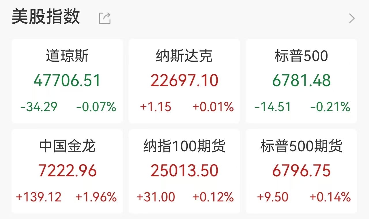 截至收盘,道琼斯指数报47,706.51点,下跌34.29点;标普500指数报6,781.48点,下跌14.51点;纳斯达克指数报22,697.10点,微涨1.15点。科技股成为盘中少数亮点,英伟达、Meta涨幅均超1%,微软小幅回调。