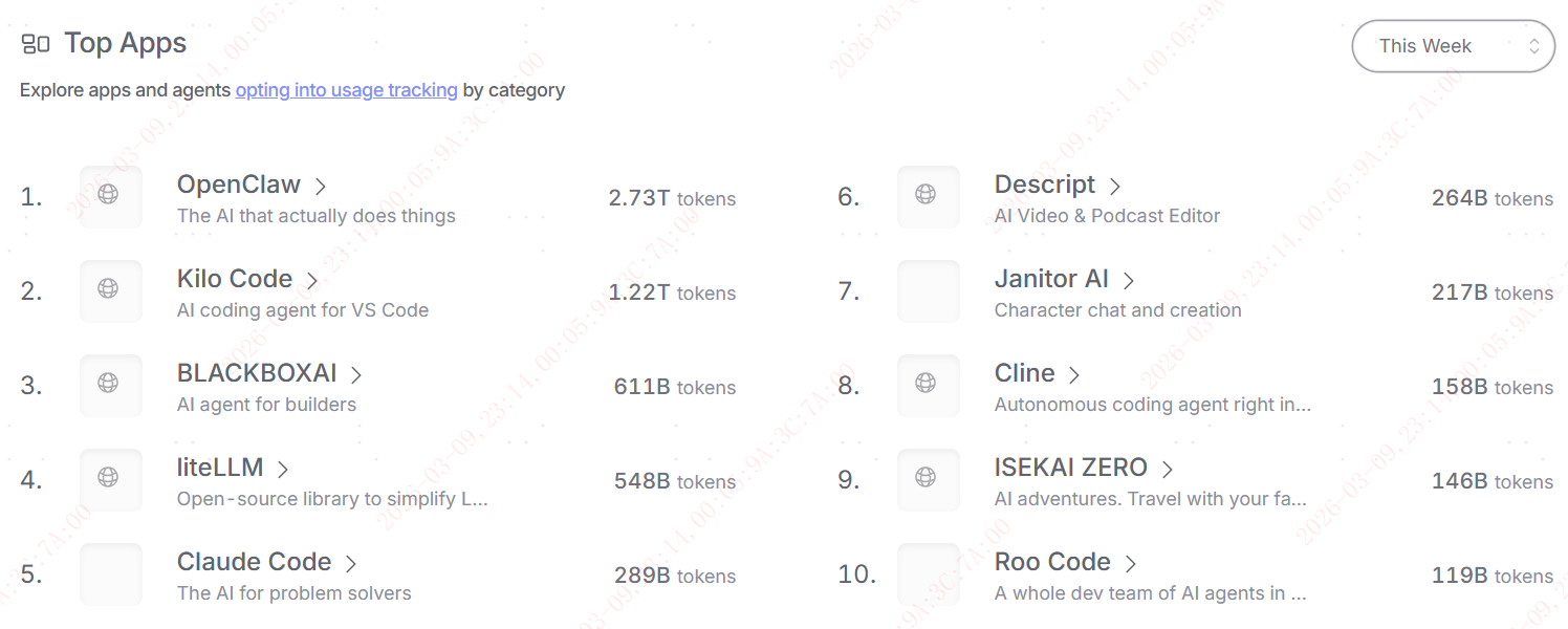 图1:全球前十大AI APP消耗Token量(3月2日-3月8日)