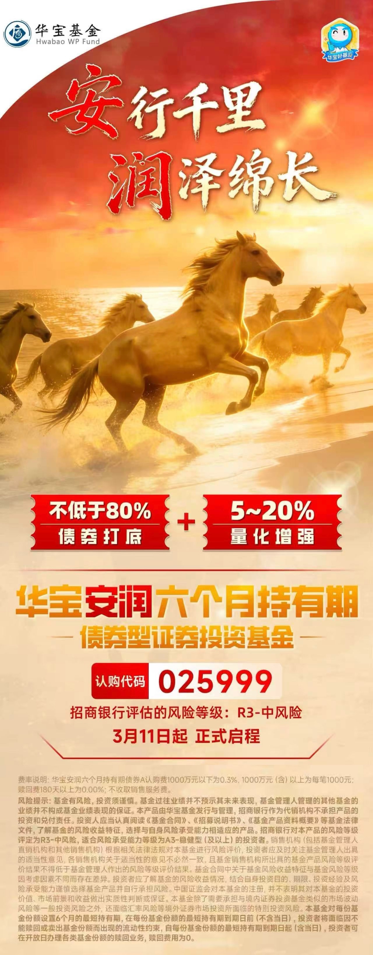 风险提示:华宝安润六个月持有期债券基金由华宝基金发行与管理,代销机构不承担产品的投资和兑付责任。投资人应当认真阅读《基金合同》、《招募说明书》、《基金产品资料概要》等基金法律文件,了解基金的风险收益特征,选择与自身风险承受能力相适应的产品。招商银行判定的华宝安润六个月持有期债券基金风险等级为R3-中风险,适宜稳健型(A3)及以上的投资者,适当性匹配意见请以销售机构为准。基金有风险,投资须谨慎。基金管理人管理的其他基金业绩不构成基金业绩表现保证。基金过往业绩并不预示其未来表现,基金投资需谨慎!销售机构(包括基金管理人直销机构和其他销售机构)根据相关法律法规对华宝安润基金进行风险评价,投资者应及时关注基金管理人出具的适当性意见,各销售机构关于适当性的意见不必然一致,且基金销售机构所出具的基金产品风险等级评价结果不得低于基金管理人作出的风险等级评价结果。基金合同中关于基金风险收益特征与基金风险等级因考虑因素不同而存在差异。投资者应了解基金的风险收益情况,结合自身投资目的、期限、投资经验及风险承受能力谨慎选择基金产品并自行承担风险。中国证监会对华宝安润基金的注册,并不表明其对其投资价值、市场前景和收益做出实质性判断或保证。华宝安润六个月持有期债券基金对每份基金份额设置6个月的最短持有期,在每份基金份额的最短持有期到期日前(不含当日),投资者将面临因不能赎回或卖出基金份额而出现的流动性约束,自每份基金份额的最短持有期到期日起(含当日),投资者可在开放日办理各类基金份额的赎回业务,赎回费用为0