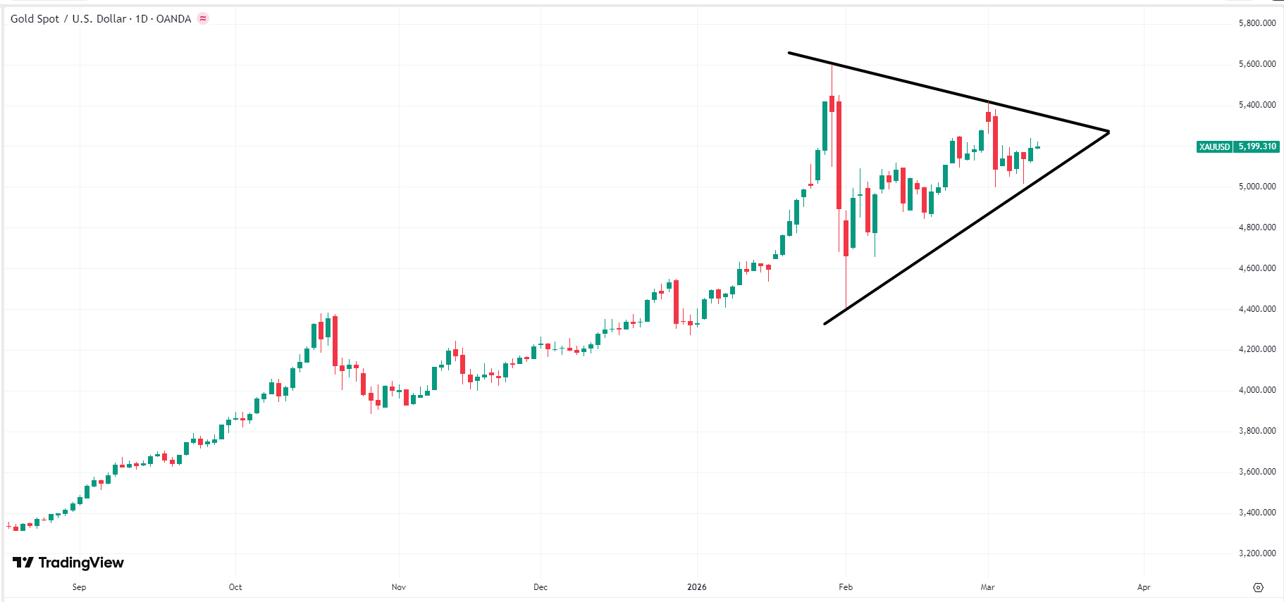 3月11日(GMT 8),现货黄金 (XAUUSD) 延续震荡行情,徘徊于5,200美元/盎司附近。上周一(3月2日),金价短暂升至5,400美元,但是未能继续走高,维持高位盘整。目前,黄金价格走势呈现对称三角形形态,意味着向上或向下的可能性均为50%。