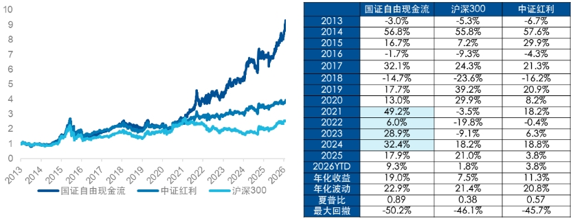 从市场实际表现来看,国证自由现金流指数已在近期地缘与再通胀交易的共振中,展现出强劲的抗跌性和收益性;长期优异穿越周期的业绩表现,为投资者更添一份守财的信心。国证自由现金流指数自基日以来展现出 “涨得多、跌得少”的优异特征,13年间有 10年录得正收益。2013年以来年化收益达19.0%,大幅跑赢沪深 300、中证红利等主流指数,风险收益比突出。在市场上行阶段,指数能紧跟甚至超越市场涨幅,分享行情红利;在市场下行或震荡阶段,抗跌韧性尽显,2018年、2022年两轮深度调整中,回撤幅度显著低于主要宽基风格指数。特别在2021~2023年的熊市中连续取得正收益,相对沪深300累计超额达110%。