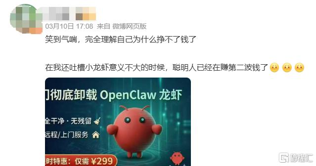吃瓜网友则戏称,OpenClaw用户市场已实现收割闭环。499上门装虾的人,开始赚299卸虾的钱了。