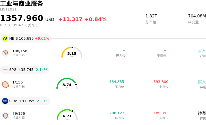 美国废物管理 (WM) 开盘下跌4.77%, 所属行业工业与商业服务上涨0.84% ,公司涨幅跑输行业涨幅,行业成交额前三股票 Nebius Group NV (NBIS) 上涨 9.61%;标普全球 (SPGI) 下跌 2.14%;Cintas Corp (CTAS) 下跌 2.20%。