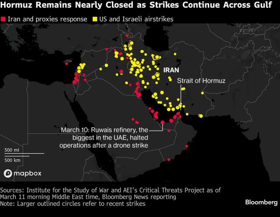 霍尔木兹海峡自战争爆发以来几乎完全无法通航。这场仗迄今已经打了12天,双方都发射了大量的导弹和无人机。中东多家能源巨头都削减了产量。