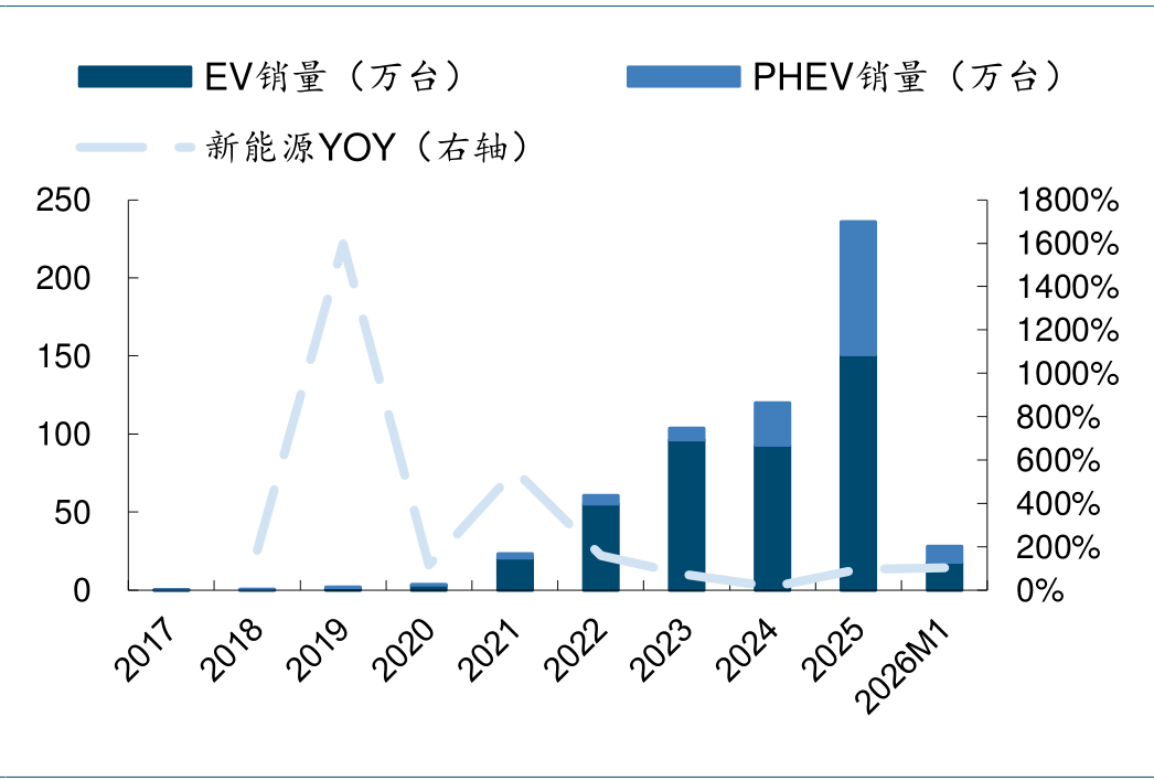 图:2017-2026新能源车年度出口销量(万辆)及同比增速