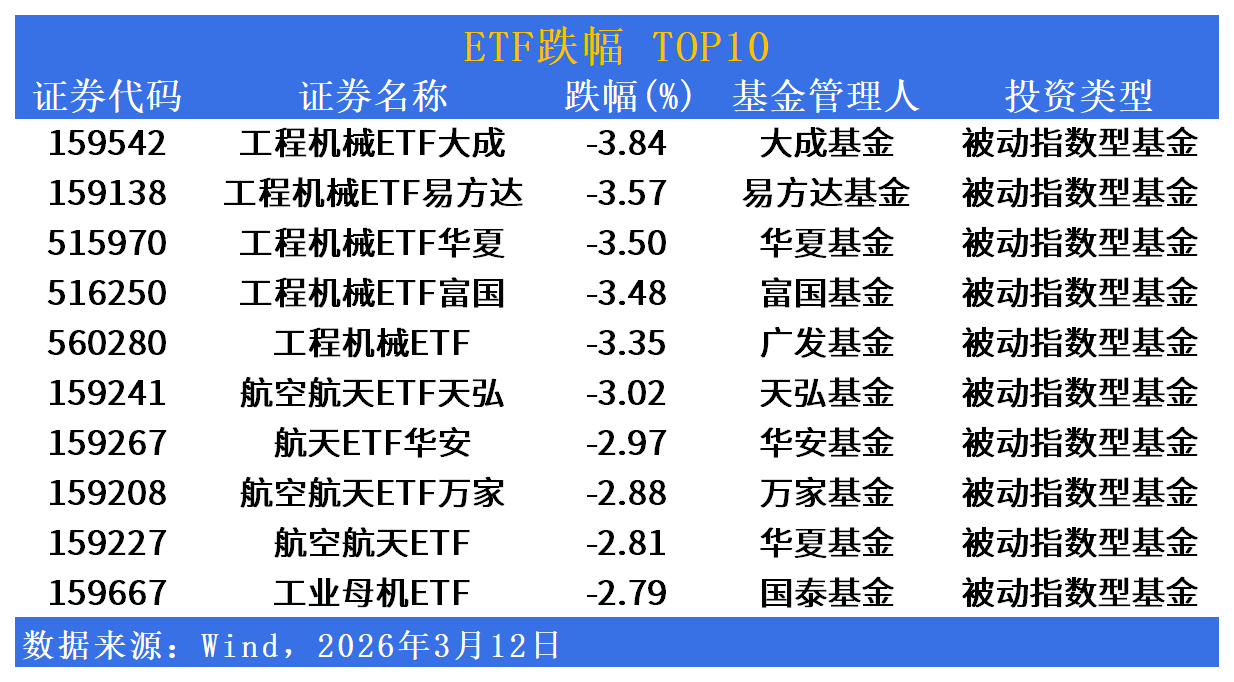 跌幅方面,工程机械与航空航天ETF深度回调,高端制造板块承压明显