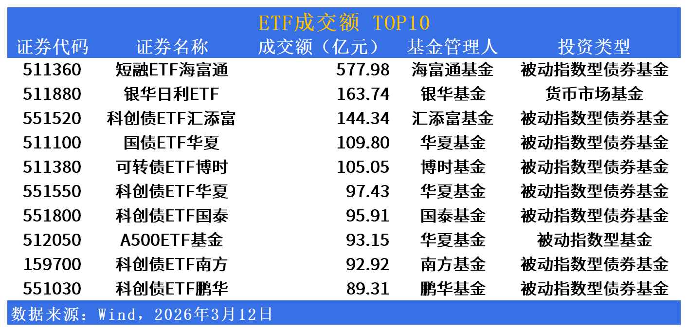 短融ETF海富通(511360)单日成交577.98亿元稳居榜首,银华日利ETF(511880)成交163.74亿元。债券ETF集群持续活跃,科创债ETF汇添富(551520)成交144.34亿元,国债ETF华夏(511100)成交109.80亿元,可转债ETF博时(511380)成交105.05亿元,科创债ETF华夏(551550)成交97.43亿元,科创债ETF国泰(551800)成交95.91亿元,A500ETF基金(512050)成交93.15亿元,科创债ETF南方(159700)成交92.92亿元,科创债ETF鹏华(551030)成交89.31亿元。