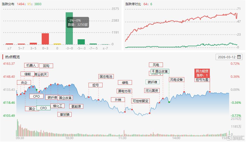 3月12日,A股主要指数集体下跌,沪指跌0.1%报4129点,深证成指跌0.63%,创业板指跌0.96%。沪深两市成交额2.44万亿,较上一个交易日缩量665亿,近3900股下跌。
