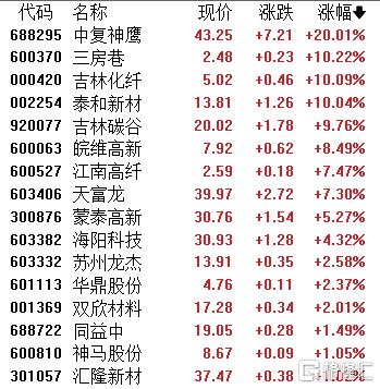 化学纤维板块走高,中复神鹰、三房巷、吉林化纤、泰和新材涨停,吉林碳谷、皖维高新、江南高纤跟涨。