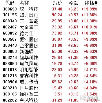 风电设备板块涨幅居前,双一科技20CM涨停,海力风电、三一重能、大金重工、德力佳、振江股份等跟涨。
