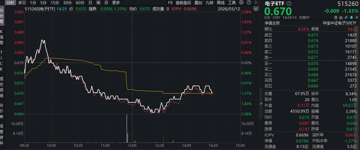 热门ETF方面,周四(3月12日)覆盖苹果、英伟达等热门科技巨头产业链的电子ETF(515260)场内价格早盘拉升1%,后随市震荡回调,场内价格现跌1.33%,值得一提的是,该ETF昨天单日吸金545万元,或有资金看好电子板块后市表现,提前进场埋伏!