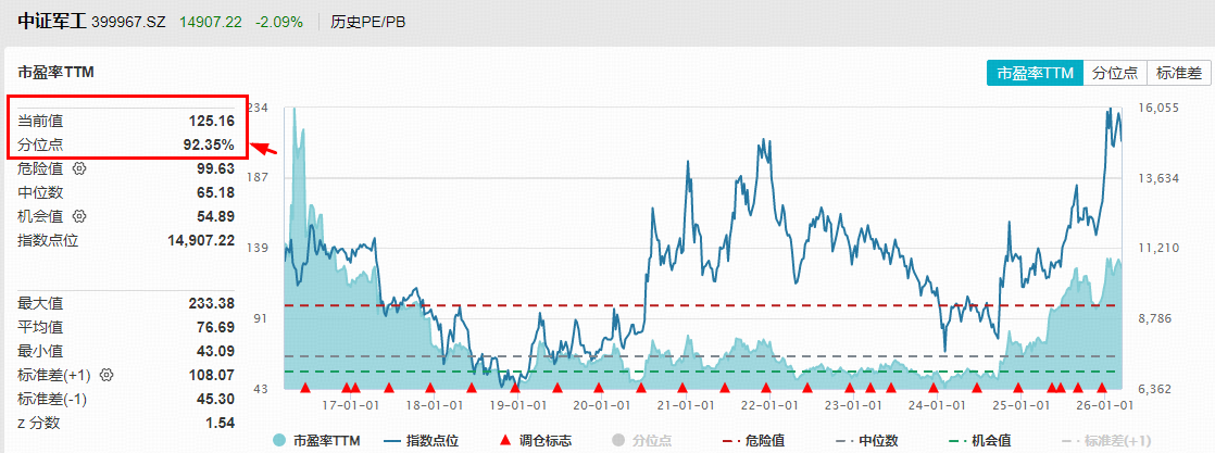 近期军工走势震荡,什么原因?市场分析认为,此前地缘政治事件驱动板块快速上涨,为技术性回调和获利盘出清埋下伏笔。当前军工板块估值已处于历史较高水平,安全边际收窄,使其对市场流动性和风险偏好变动更为敏感。