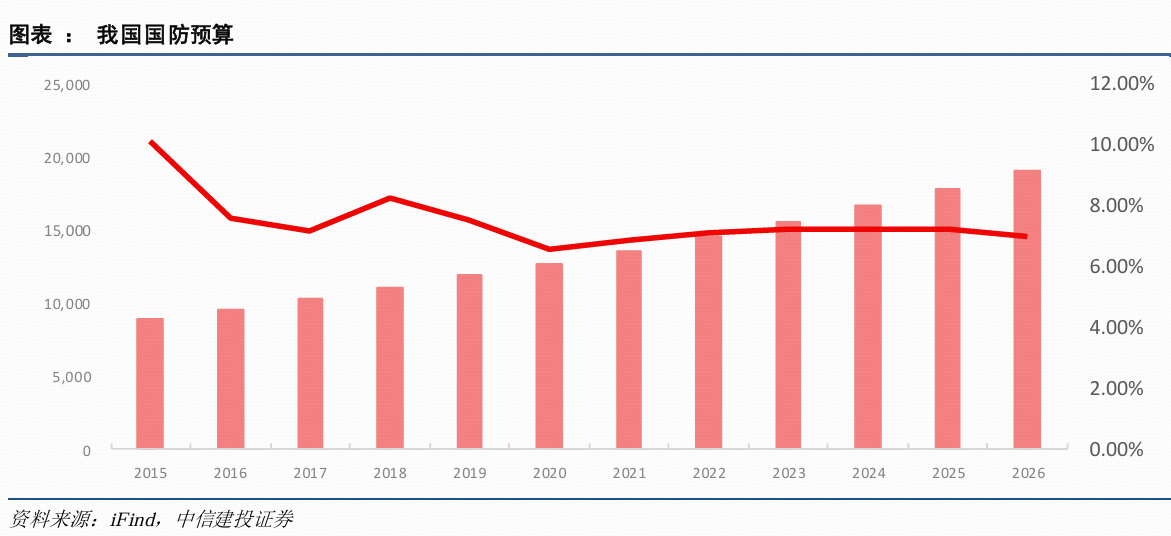 根据日前发布的2026年中央和地方财政预算草案报告,2026年我国国防支出为19095.61亿元人民币,同比增长7%。中信建投证券预计,十五五期间我国国防预算仍将保持 7-7.5%左右的稳定增长,占 GDP 比重或有一定提升空间。
