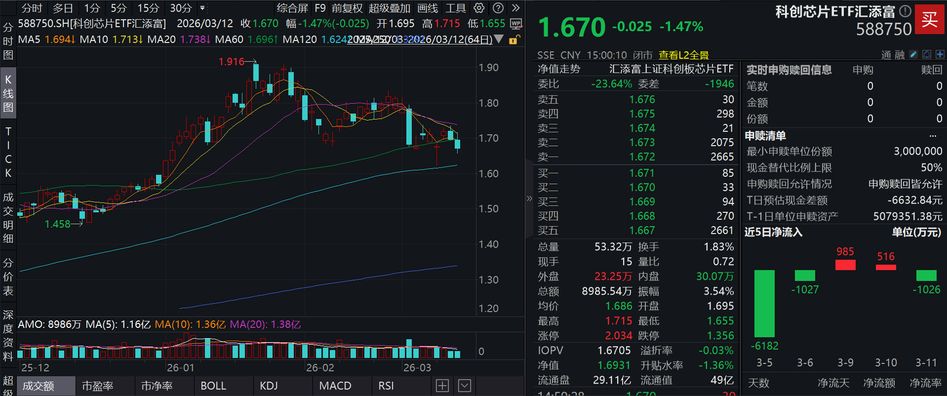流动性方面,科创芯片ETF汇添富换手1.83%,成交8985.54万元。拉长时间看,截至3月12日,科创芯片ETF汇添富近1年日均成交1.51亿元,排名可比基金前3。