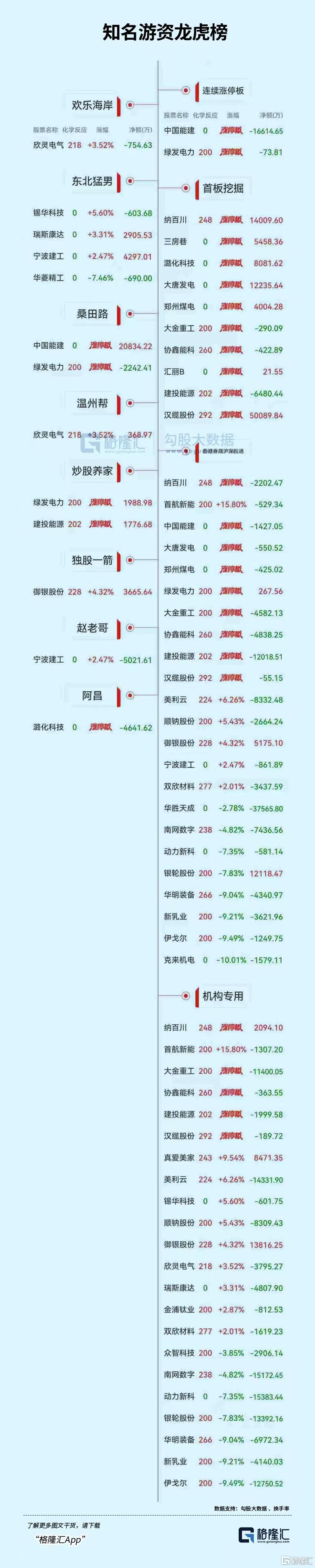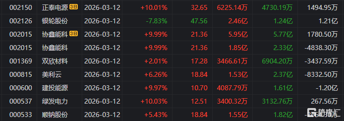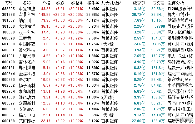 个股方面,金开新能10天5板,金牛化工9天5板,中南文化4连板,中国能建、协鑫能科等5天3板,华电能源、绿发电力等3连板,节能风电、绿色动力等2连板。