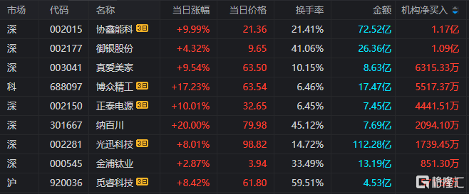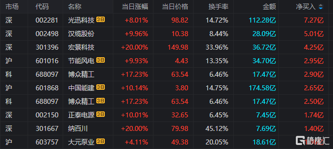 龙虎榜单日净买入额前三为汉缆股份、宏景科技、博众精工,分别为5.01亿元、4.25亿元、2.90亿元。