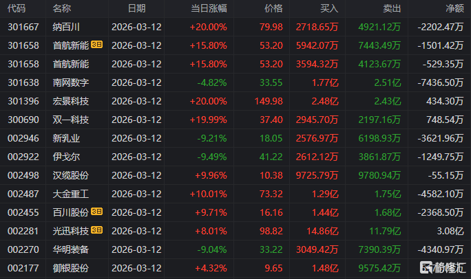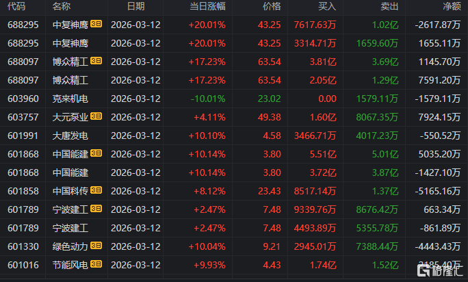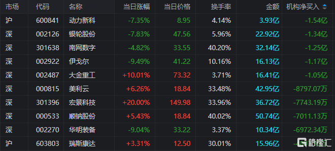 龙虎榜中涉及机构专用席位的个股中,单日净卖出额前三为动力新科、银轮股份、南网数字,分别为1.54亿元、1.34亿元、1.25亿元。