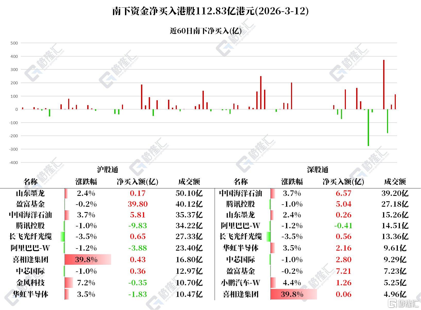 3月12日,南下资金净买入港股112.83亿港元。
