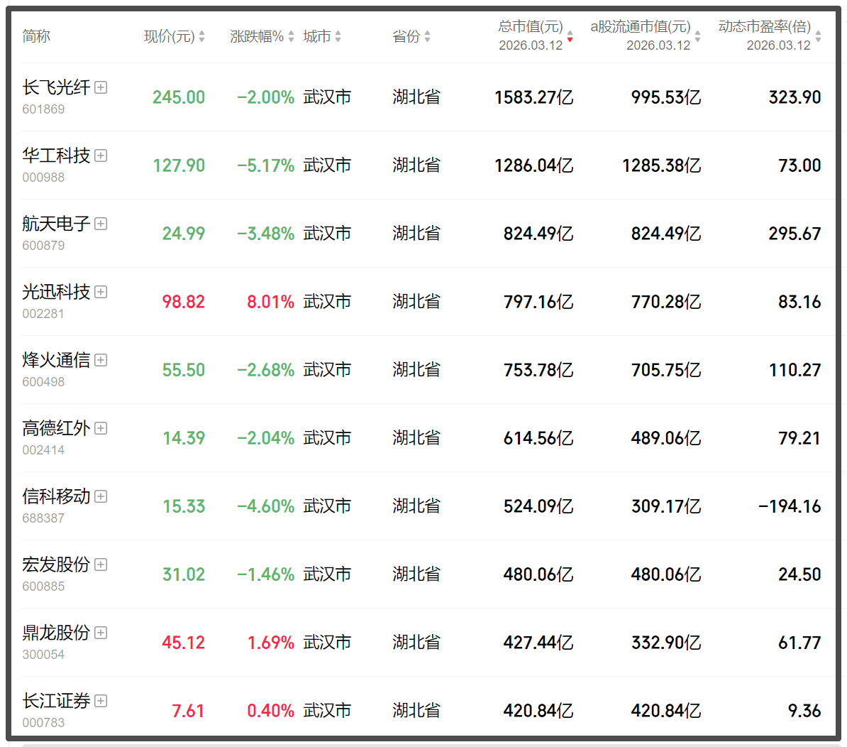 值得注意的是,华工科技此前走出了强势的连续上涨行情,春节后一波涨幅高达88%,今日剧烈震荡后,其总市值仍维持在1286亿元的高位水平,位列武汉市上市公司第二名,仅次于长飞光纤。