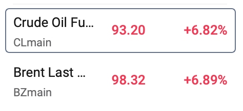 布伦特原油期货一度重返每桶98美元,涨幅近7%,WTI原油期货重返93美元,涨幅超6.8%。
