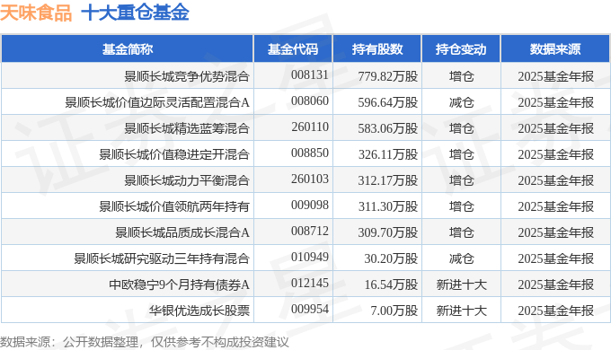 持有天味食品最多的基金为景顺长城竞争优势混合,目前规模为19.78亿元,最新净值0.9239(3月12日),较上一交易日下跌0.09%,近一年上涨10.0%。该基金现任基金经理为刘苏。