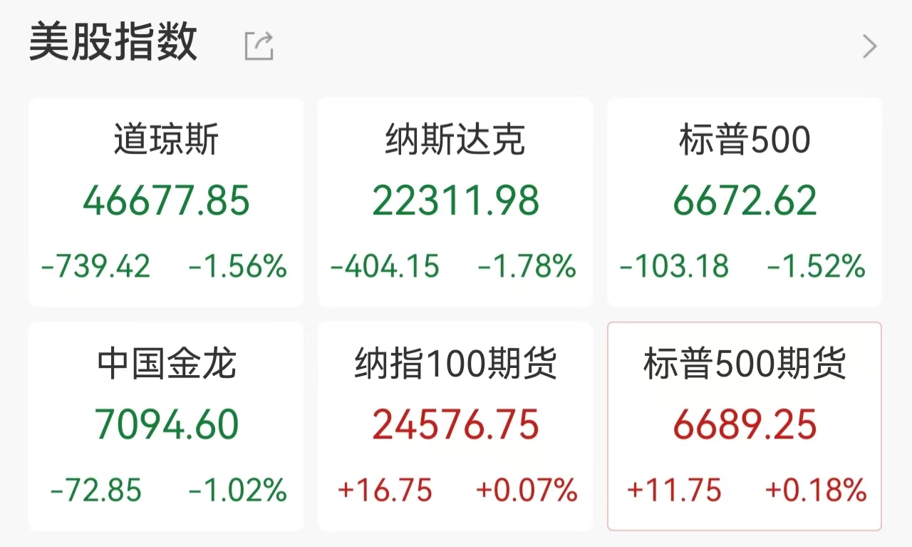 受地缘政治风险与通胀担忧双重打击,美国股市周四大幅下跌。截至收盘,道琼斯工业平均指数下跌739.42点,跌幅1.56%,报46677.85点;标普500指数下跌103.18点,跌幅1.52%,报6672.62点;纳斯达克综合指数下跌404.15点,跌幅1.78%,报22311.98点。