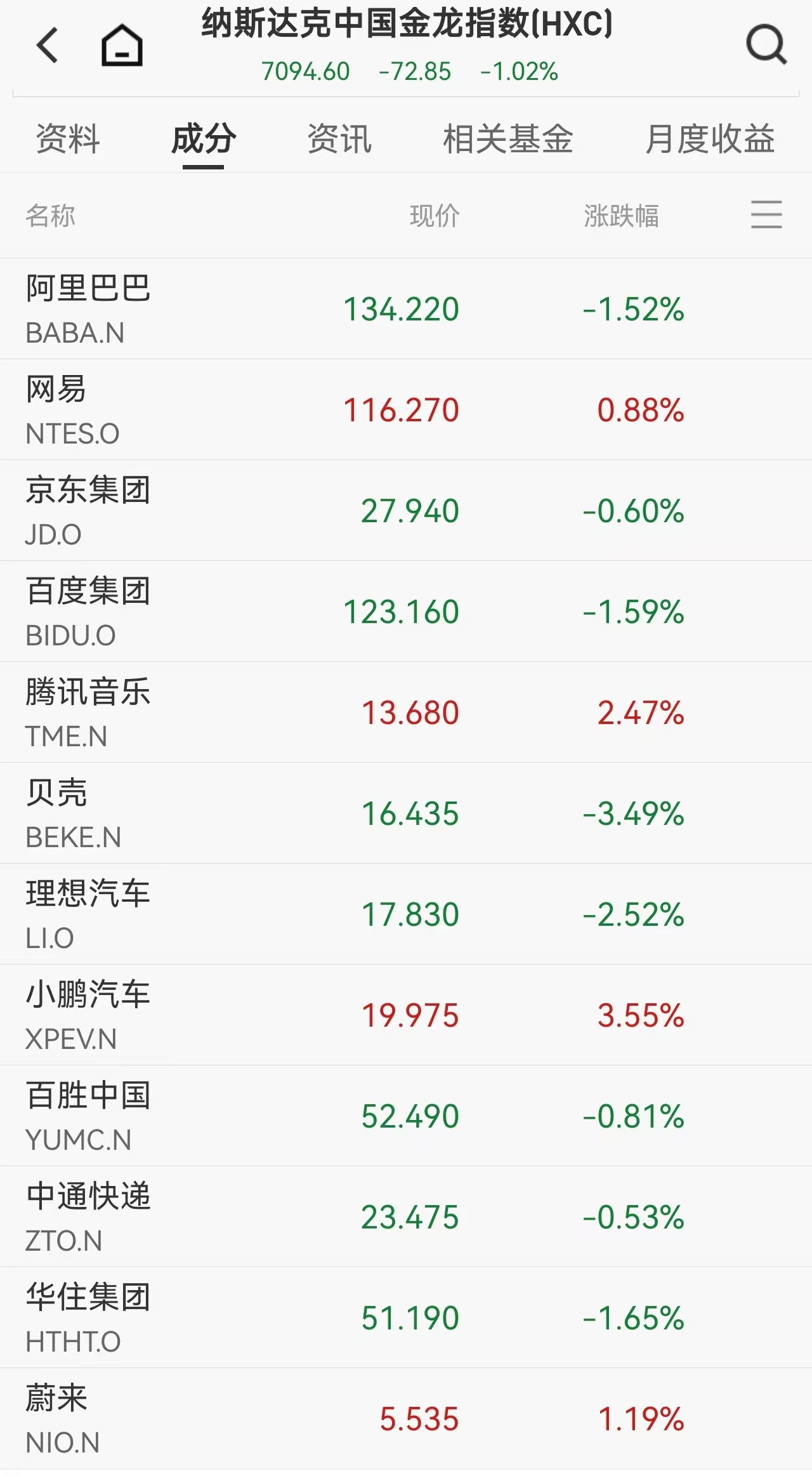 纳斯达克中国金龙指数收跌1.02%。个股表现分化明显,小鹏汽车涨3.55%,蔚来涨1.19%,腾讯音乐涨2.47%,网易涨0.88%;富途控股跌6.31%,贝壳跌3.49%,理想汽车跌2.52%,百度跌1.59%,阿里巴巴跌1.52%,拼多多跌1.28%。