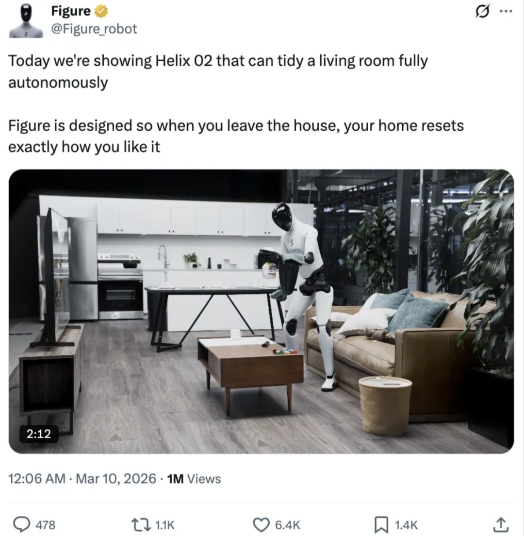 2026年3月10日,Figure发布的Helix02系统视频,向公众展示了什么是真正的完全自主、端到端全流程家务能力。与春晚舞台上对齐剧本的表演不同,这次Figure机器人自主进入了充满随机性的真实客厅
