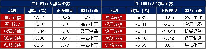 【转债市场主要指数集体跟跌】 3月12日,转债市场跟随权益市场有所走弱,中证转债、上证转债、深证转债分别收跌1.05%、1.05%、1.06%。转债市场成交额634.33亿元,较前一交易日缩量33.34亿元。转债市场个券多数下跌,375支转债中,171支收涨,182支下跌,22支持平。当日上涨个券中,新上市海天转债涨超47%,存量个券中百川转2涨超16%;下跌个券中,嘉泽转债、亿田转债、锋工转债跌逾9%。