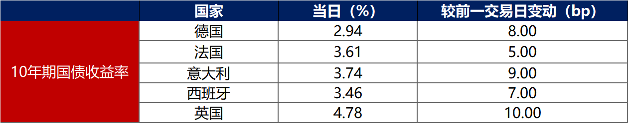 3月12日,主要欧洲经济体10年期国债收益率普遍上行。其中,德国10年期国债收益率上行8bp至2.94%,法国、意大利、西班牙、英国10年期国债收益率分别上行5bp、9bp、7bp和10bp。