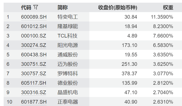 光伏ETF招商(516230)是个省心的选择,它跟踪中证光伏产业指数,前十大重仓股包括特变电工、隆基绿能、TCL科技、阳光电源、通威股份、迈为股份、罗博特科、德业股份、晶盛机电、正泰电器,合计权重超50%。从上游硅料到中游电池组件再到下游逆变器,光伏产业链的核心环节基本都包圆了。