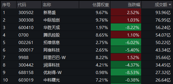 云计算ETF汇添富(159273)标的指数权重股涨跌互现:优刻得-W、华胜天成跌超8%,拓维信息跌超6%,网宿科技跌超5%。上涨方面,新易盛涨超2%,中际旭创、腾讯控股、阿里巴巴-W涨超1%。