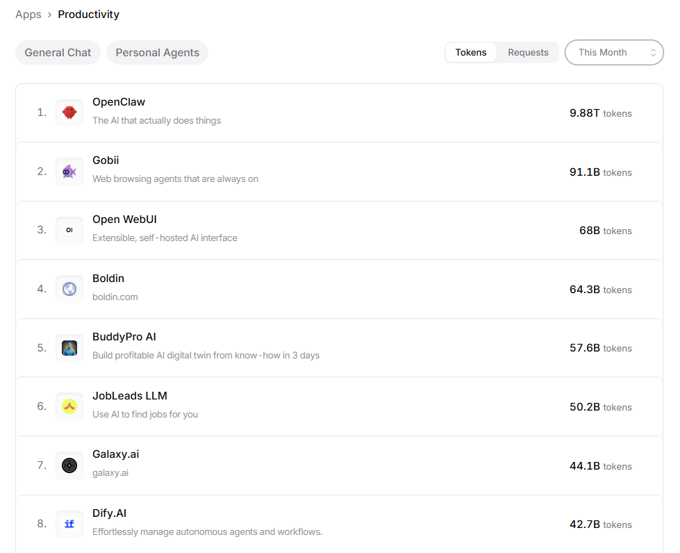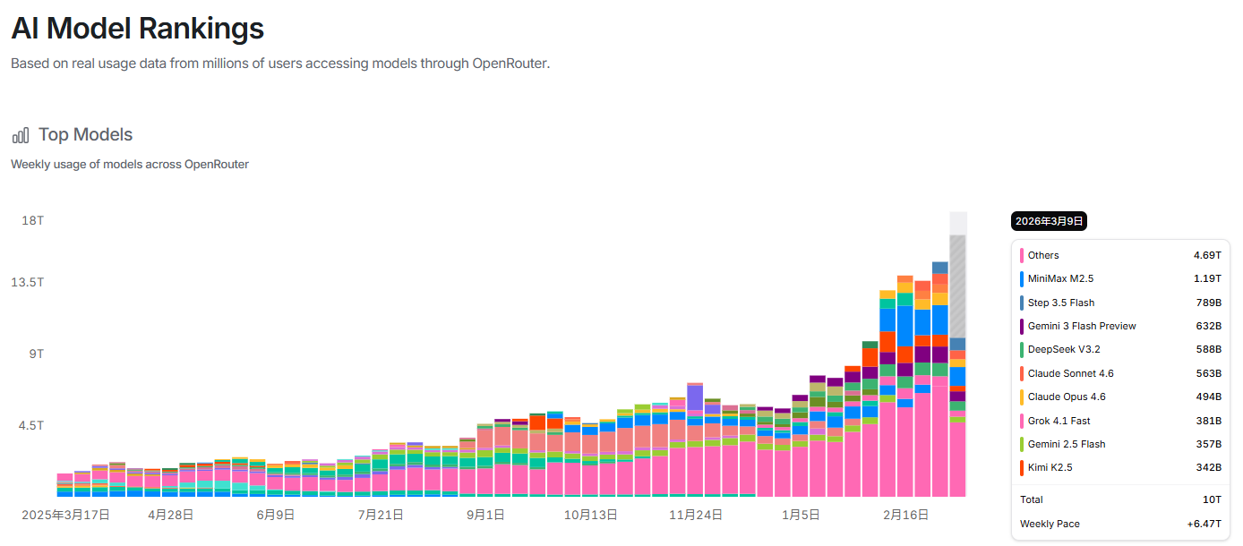 OpenClaw爆发,Token消耗数加速攀升。参考OpenRouter平台的整体token消耗情况,可以发现平台自26年以来出现阶跃性攀升。仅参考最近两周数据,2月16-22日,OpenClaw token消耗量/openrouter平台token总消耗量为2.05T/2.15T;2月23-3月1日,OpenClaw token消耗量/openrouter平台token总消耗量为2.26T/2.39T;整体来看,OpenClaw针对OpenRouter平台token消耗量拉动明显,且为其主要贡献来源。