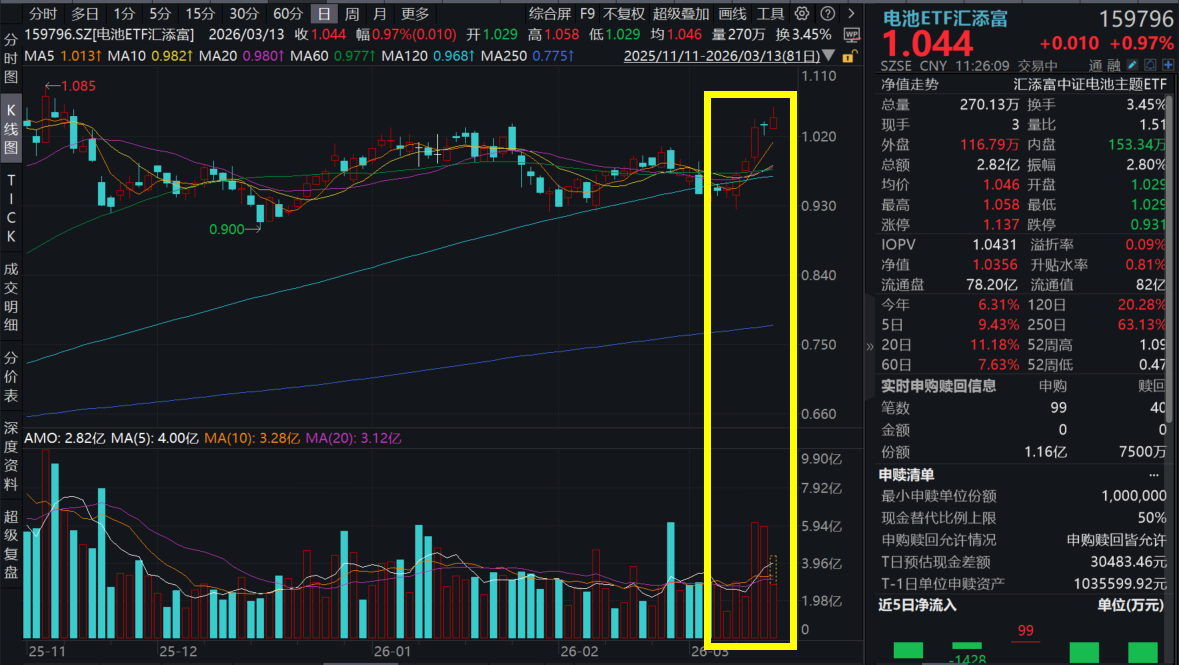 3月13日,A股市场震荡回调,电池板块逆势冲高!截至午盘,同类规模领先、费率最低档的电池ETF汇添富(159796)涨0.97%,冲击7连涨,资金小幅跑步进场,电池ETF汇添富(159796)盘中吸金超4200万元!