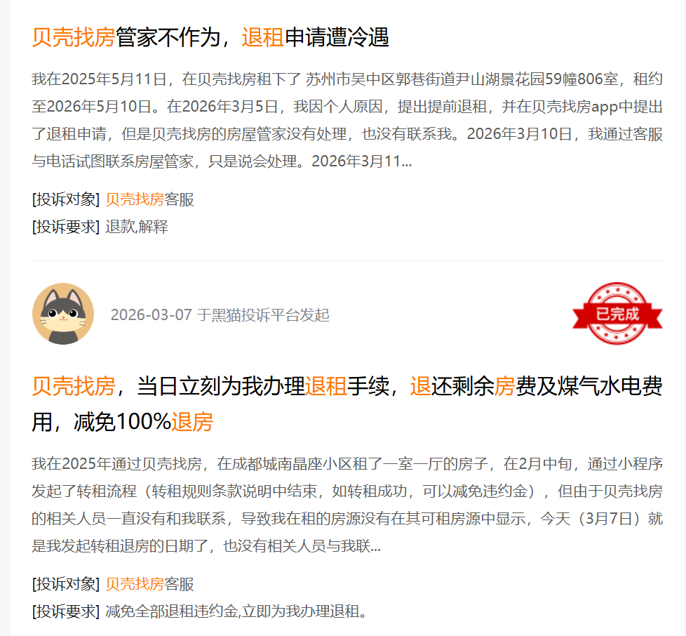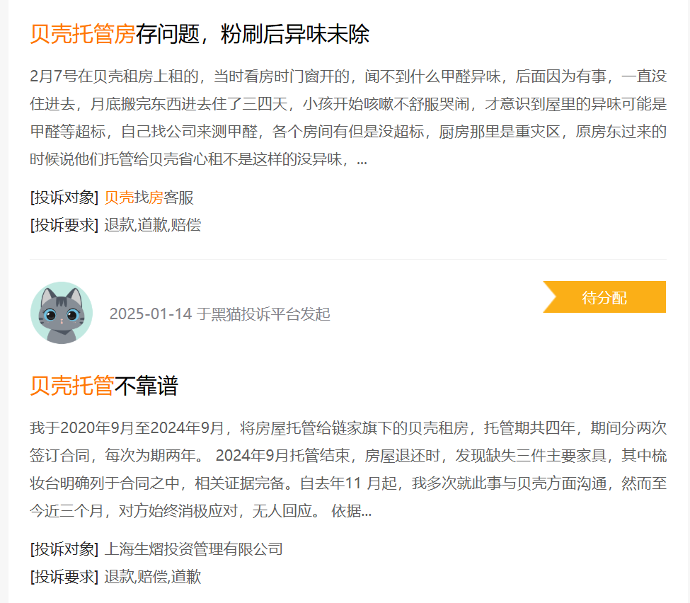 据相关报道,黑猫投诉平台上关于贝壳找房的投诉量显示为2942条,其中大量投诉指向 “虚假宣传”“未履行服务”。有租客反映,贝壳省心租交付房源前未认真验房,导致房源设备故障频发,而平台此前承诺的维修服务、“无忧换房” 等权益,也均未实际兑现。
